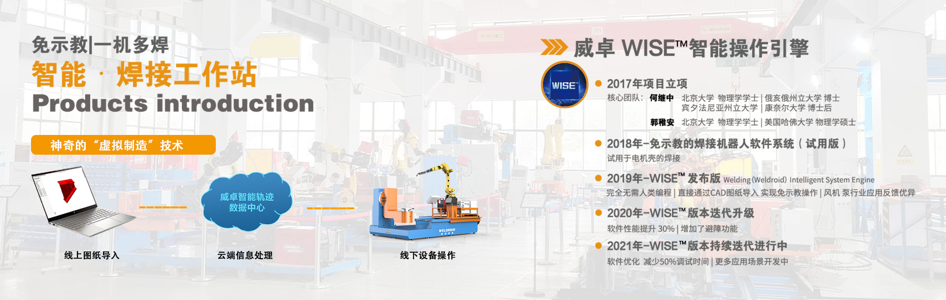 無錫威卓智能機(jī)器人有限公司成立于2017年,是無錫市政府引進(jìn)的科技領(lǐng)軍型高新技術(shù)企業(yè),公司研發(fā)團(tuán)隊(duì)80余人,我們堅(jiān)持自主創(chuàng)新,利用自主開發(fā)的虛擬制造技術(shù)對傳統(tǒng)焊接行業(yè)進(jìn)行升級改造。 公司主推的工業(yè)風(fēng)機(jī)系列-智能焊接工作站產(chǎn)品,具有免示教、實(shí)時(shí)跟蹤、簡易工裝、傻瓜式操作等優(yōu)點(diǎn),真正幫助企業(yè)解決了招焊工難,用工成本高,焊接質(zhì)量不穩(wěn)定等問題。